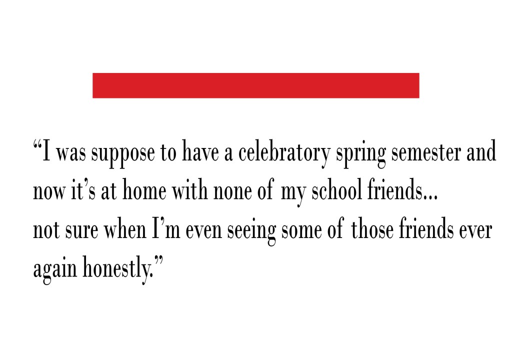 “I was supposed to have a celebratory spring semester and now it’s at home with none of my school friends,” Josh shared with me. “[I’m] not sure when I’m even seeing some of those friends ever again honestly.”